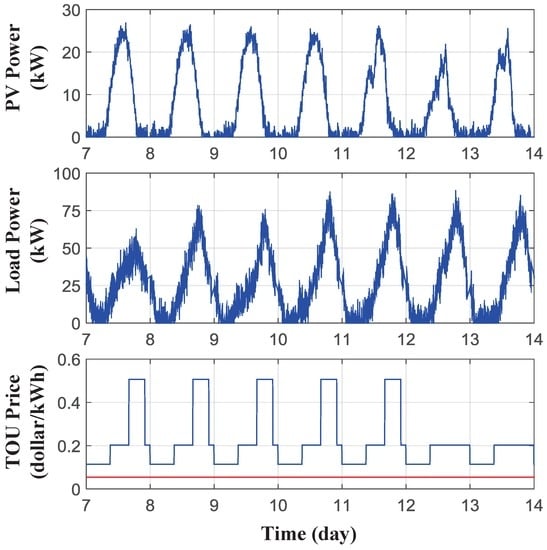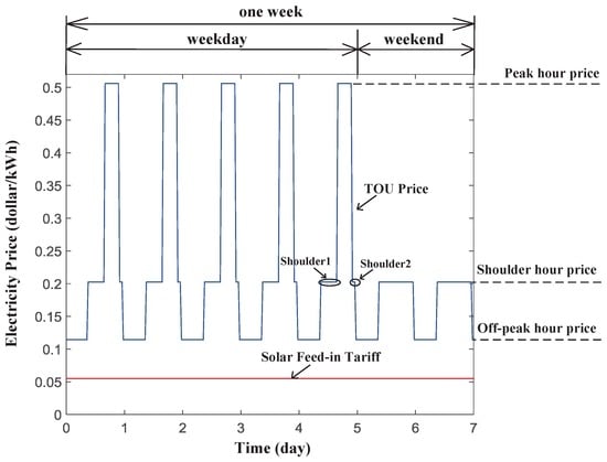 As discussed in the Introduction, one of the main reasons for employing BESS in residential applications is to reduce the electricity bills of users. Such a requirement necessitates the investigation of relevant market policy. In reality, the TOU retail market policy becomes increasingly prevalent in residential areas. Thus, this section mainly introduces the TOU electricity price (the price that the grid operator charges users when they buy electricity) [9], which varies with respect to time. Without loss of generality, the TOU electricity price in Australia is used as an illustrative example. Its profile is given by the blue curve in Figure 5, where two different price patterns are periodically used in weekdays (three price regions: peak, shoulder and off-peak) and weekends (two price regions: shoulder and off-peak). In comparison, the low solar feed-in tariff (the price the grid operator pays users when they sell solar energy back to the grid) [7] is shown by the red line in Figure 5, from which it can be clearly seen that selling energy back to the grid is not an economically-desirable choice.