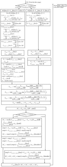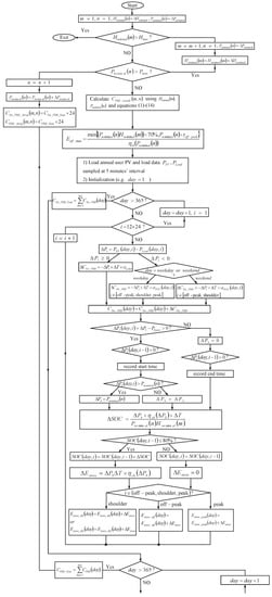 In each combination, VRB cost is computed by Equations (1) to (14). Then, the maximum amount of energy that can be bought for charging VRB in the off-peak region, i.e., , is calculated by comparing the VRB energy storage limit (, where the allowable VRB SOC operating range is chosen as 10% to 80%) and the available energy in off-peak time interval () and, subsequently, dividing VRB charge efficiency to compensate for energy loss. In the next step, the annual user PV and load power data, which are sampled at five-minute intervals, are loaded, and two internal iterations for daily electricity cost estimation (denoted by () in the rhombus) are started.