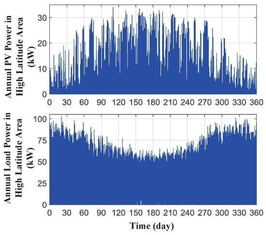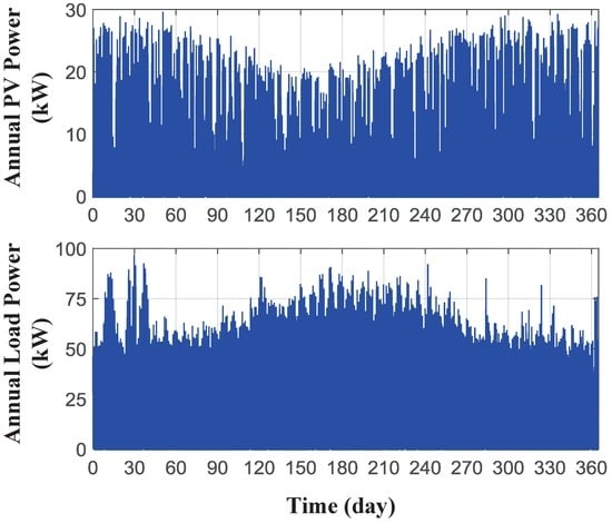 It is pointed out that the proposed algorithm aims to provide an estimation of the potential economic benefit by employing the VRB system, which serves as a guideline for users to optimize the size of their VRB. It is implemented in the offline planning stage by using historical user load and/or PV data depending on the availability of PV system. For instance, for users without PV system, this algorithm is also applicable by setting input PV power to zero. To demonstrate its effectiveness, two sets of simulations are carried out by using the load and PV data in residential areas, which are sampled at 5-min intervals, as shown in Figure 7 and Figure 8. Here, Figure 7 presents the annual power profiles, and Figure 8 gives an enlarged view of part of Figure 7 aligned with the TOU price profile. The original PV and load data are downloaded from PVOutput [24] and Australian Energy Market Operator (AEMO) [25], respectively. In this study, they are re-scaled to represent the annual PV and load power of a typical residential building (usually consisting of tens of homes).