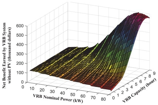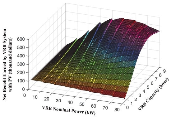 From Figure 9, it is observable that the economic benefit earned by VRB can be quite significant, and it varies with respect to battery nominal power and capacity. Here, the ranges of VRB nominal power and capacity variations are selected to be the same as those in the overall cost computation (Figure 2). They can be modified by users according to their expectations. Obviously, under such circumstances, the peak region of net economic benefit is reached by selecting VRBs with high capacity (9 h) and reasonably high nominal power (between 40 kW to 60 kW). The maximum net economic benefit of nearly 500 thousand dollars is gained by choosing VRB rated at 49.5 kW and 9 h. It is noted that the discontinuities on the surface of Figure 9 are caused by the varying numbers of VRB stacks.