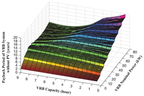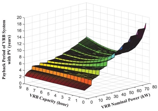 In addition to the investigation of net economic benefit, the analysis of the rate of return and payback period is also crucial for users to quantitatively evaluate the effectiveness of their investment. In the studied case of VRB with the PV system, the rate of return and payback period are illustrated in Figure 10 and Figure 11, respectively (again, discontinuities on the surface of Figure 10 and Figure 11 are the result of the sudden VRB stack number changes due to the increasing nominal battery power). From Figure 10, it is seen that investing in VRBs with low nominal power can usually lead to a high earning rate. Furthermore, in the range of 40 to 80 kW, a higher rate of return can be obtained by choosing VRB capacity to be within 4 to 6 h. In most cases, a VRB with suitable ratings can provide a reasonably good earning rate. For instance, the rate of return of the VRB offering maximum net economic benefit is approximately 2.98, which is quite attractive. The payback period is generally maintained at acceptable levels for VRB with high capacity, as shown in Figure 11. It increases drastically when the VRB capacity is too low. For the VRB offering maximum net economic benefit, the payback period is about six years, which means the investment cost can be earned back within one fourth of the battery lifespan. The large net benefit, high rate of return and short payback period qualify VRB as a promising battery technology for residential applications. In comparison, the cost of the lithium battery rated at 49.5 kW and 9 h with a required working period of 24 years can be estimated by using the approach and coefficients in [21,22] as discussed in Section 2.3. Based on such estimation, it is found that the cost of the lithium battery is nearly 12-times the cost of VRB, even if only one charge/discharge cycle is implemented every day, making it undesirable for residential applications. This is especially true when renewable generation is employed by users, because the lifetime of the lithium battery will be shortened by more frequent charge/discharge operations in each day.