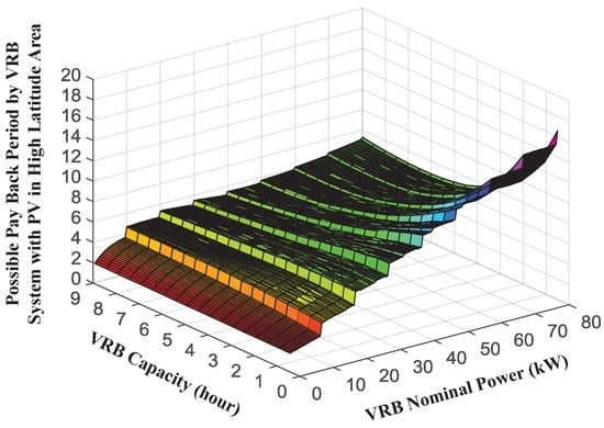 To illustrate the potential application of the VRB system in areas at a high latitude, such as northern Europe, a simulation study is carried out with annual PV and load power data in such areas as shown in Figure 15. Since the TOU electricity price varies from area to area and has not yet been widely adopted in the areas at a high latitude, the TOU price profile in Figure 5 is used here for illustrative purpose. Under such situations, the net economic benefit, rate of return and payback period with varying VRB nominal power and capacity can be calculated, and the results are shown in Figure 16, Figure 17 and Figure 18, respectively. From these figures, it is visible that the employment of the VRB system in high latitude areas is also an attractive investment if the TOU electricity price policy is adopted. In fact, with an increasing population density and the penetration of electrical appliances in residential areas, the TOU electricity price can become an effective tool for shaving the peak power demand and, thus, should be widely advocated.