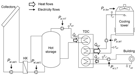 Figure 1 shows a simplified hydraulic scheme of a solar thermal cooling plant with the main energy flows and the nomenclature that will be used in this work. The main component of such systems is the TDC since it provides the cold to the building. The cooling capacity of the chiller can be influenced by acting on the operating conditions of temperature and flow rates at the three temperature levels: high temperature , middle temperature and low temperature . The hot water temperature is mainly determined by the available solar irradiation but can be influenced by controlling the solar pumps and/or by using a mixing valve between the hot storage and the chiller [9]. The chilled water temperature is usually fixed in a certain range by the cooling distribution system of the building. The heat rejection or cooling water temperature can be controlled by adjusting the speed of the cooling tower fan and/or the cooling water pump. The minimum achievable heat rejection temperature is the ambient temperature if dry coolers are used and the wet bulb temperature in case of wet cooling towers.