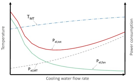 The thermal power of the heat rejection unit depends on the temperature entering the cooling tower and the flow rate of the cooling water , on the wet bulb temperature (for wet cooling towers) and on the fan frequency . Again, different kinds of models can be used. In this work, polynomial expressions have been fitted with measurement data using the least square method (see Section 3.2 and Appendix B). Both cooling water set points (temperature and flow rate) are determined by using Equations (1)–(8) in an optimization procedure so that Equation (1) is fulfilled and Equation (3) is minimized.