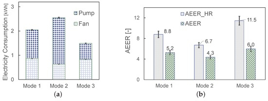 (a) power consumption distribution and (b) for the three modes shown in Figure 5. The is the average energy efficiency ratio that considers only the measured power consumption of the heat rejection system (pump and fan).