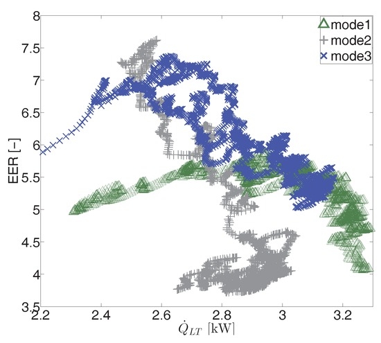 The electricity consumption of the cooling tower fan and the cooling water pumps as well as the resulting for the three presented days (Figure 5) are shown in Figure 6. It can be seen that mode 2 is not as efficient as the other two modes (). The main reason is a too high electricity consumption of the pump that is not justified by a gain in chiller cooling output. Mode 1 and mode 3 allow an efficient system operation with an of 5.2 and 6, respectively. The chiller cooling power can be modulated very efficiently by adjusting the cooling water temperature. With mode 3, the efficiency can be further increased by reducing the pump power. This effect is much larger at partial load, as can be seen in Figure 7. The efficiency of mode 3 is the highest at partial load and gets closer to the efficiency of mode 1 when reaching the maximal load. Whereas the efficiency of mode 2 is high at extreme partial load, it drops dramatically when increasing the chiller capacity (due to the lack of power modulation).