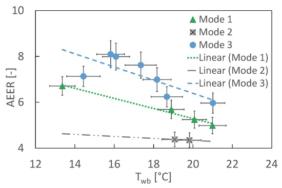More experiments than these three days have been carried out. The daily of all measurements are plotted in Figure 8 over the daily mean wet bulb temperature . Since mode 2 did not show promising results, less measurement have been performed with this mode. On the contrary, mode 3 has been extensively tested. As expected, the system efficiency of each modes increases with decreasing daily average . Figure 8 confirms the results of the three example days presented previously. Mode 3 is the most efficient with 20% and 60% increase compared to mode 1 and 2, respectively.