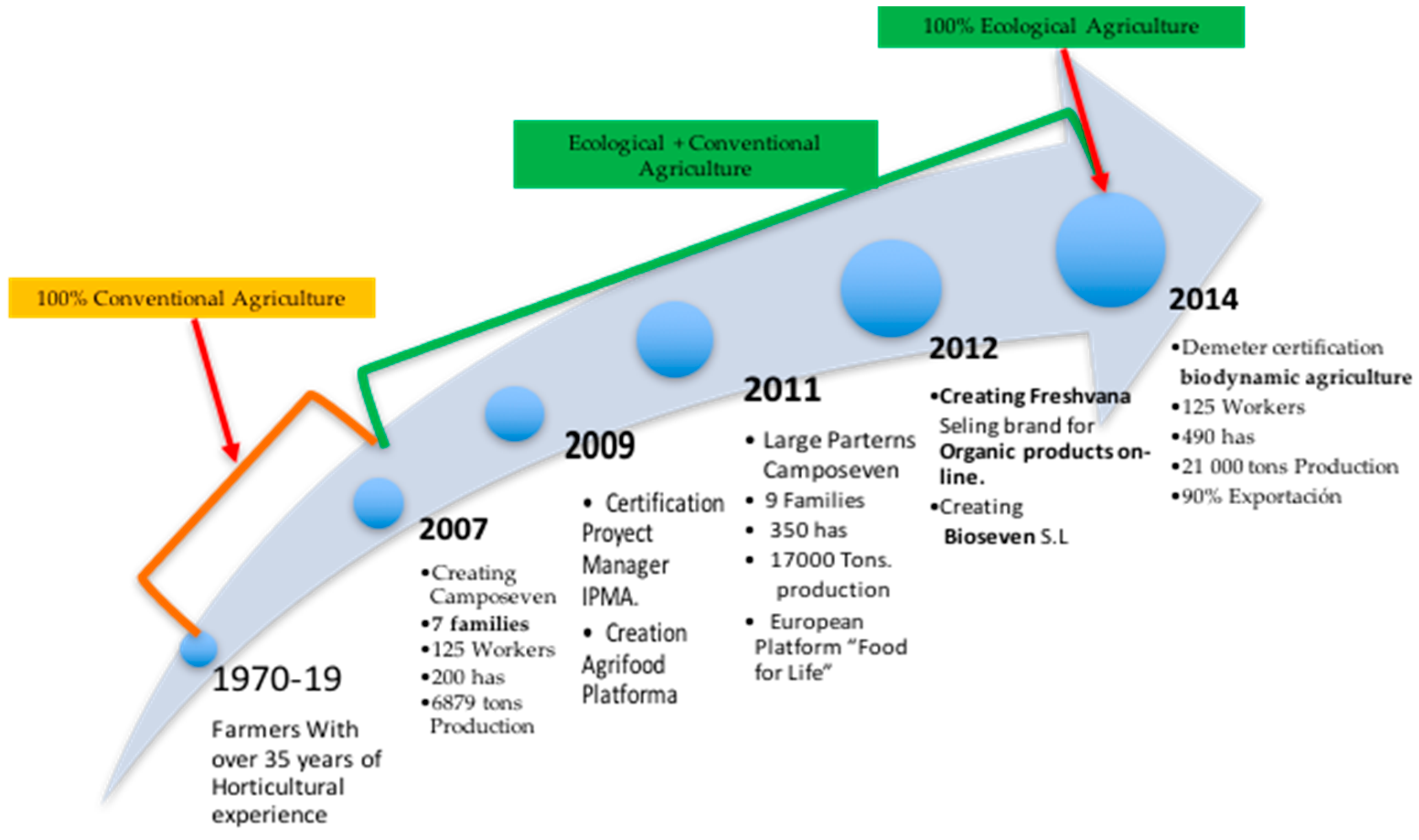 The Figure 1 shows the major milestones that have influenced changes and adaptations of the Camposeven Organic Cooperative. This temporary bonding process between farmers and the interplay between external producers and agents, has involved a social learning process for joint planning and development of common strategies among the private sector, civil society institutions and R + D + i [49].