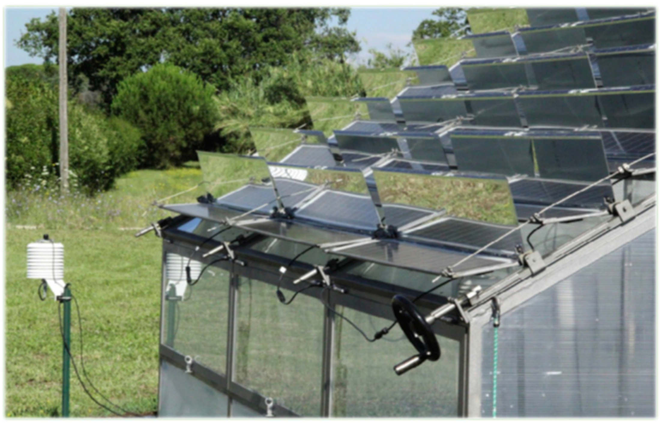 - Marucci, A.; Cappuccini, A. Dynamic photovoltaic greenhouse: Energy efficiency in clear sky. Appl. Energy 2016, 170, 362–376. [Google Scholar] [CrossRef]