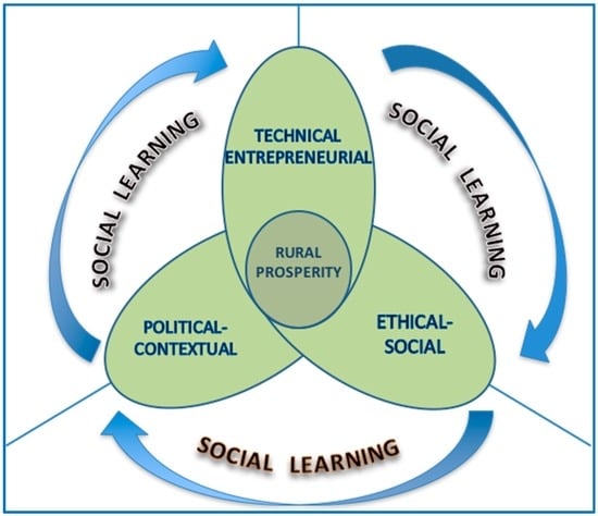 In order to collect information and systemize the analysis, a common methodological framework was designed by a panel of experts made up of 38 researchers from 14 countries in the EU, within the European Rethink project []. This common methodological framework was based on an analysis of the strategies for managing finite resources through the WWP model []. This proposal goes beyond the traditional technical-economic vision and aims to analyze the behaviors of the parties involved and the contexts in which they operate. The WWP methodological framework incorporates social learning processes for analyzing and building strategies for rural prosperity and sustainable management based on three dimensions, as shown in Figure 5 [].
