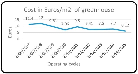 The system radiates energy to the structure’s surroundings, with 25% of this energy reaching the ground. This system has provided positive results, with reduced costs observed during each production period (Figure 8). Based on the information obtained from the farmers regarding the greenhouses’ costs per square meter (Table 4 and Figure 8), the change from a conventional to an ecological agricultural production system is quantified. A direct decrease in fossil fuels is observed (by 80%) as well as a decrease in operational costs in ecological greenhouses (2.48 Euros/m2) compared to conventional ones (3.35 Euros/m2), with an overall cost reduction of 26%. This cost reduction arising from the change to an ecological production system impacts the farmers’ financial benefits. Furthermore, the integral transformation of the ecological cooperative and the decrease in fuels and supplies, enable a more efficient use of resources, with environmental effects and a direct impact in terms of reducing greenhouse gas emissions, as well as reduced contamination of soil and aquifers [].