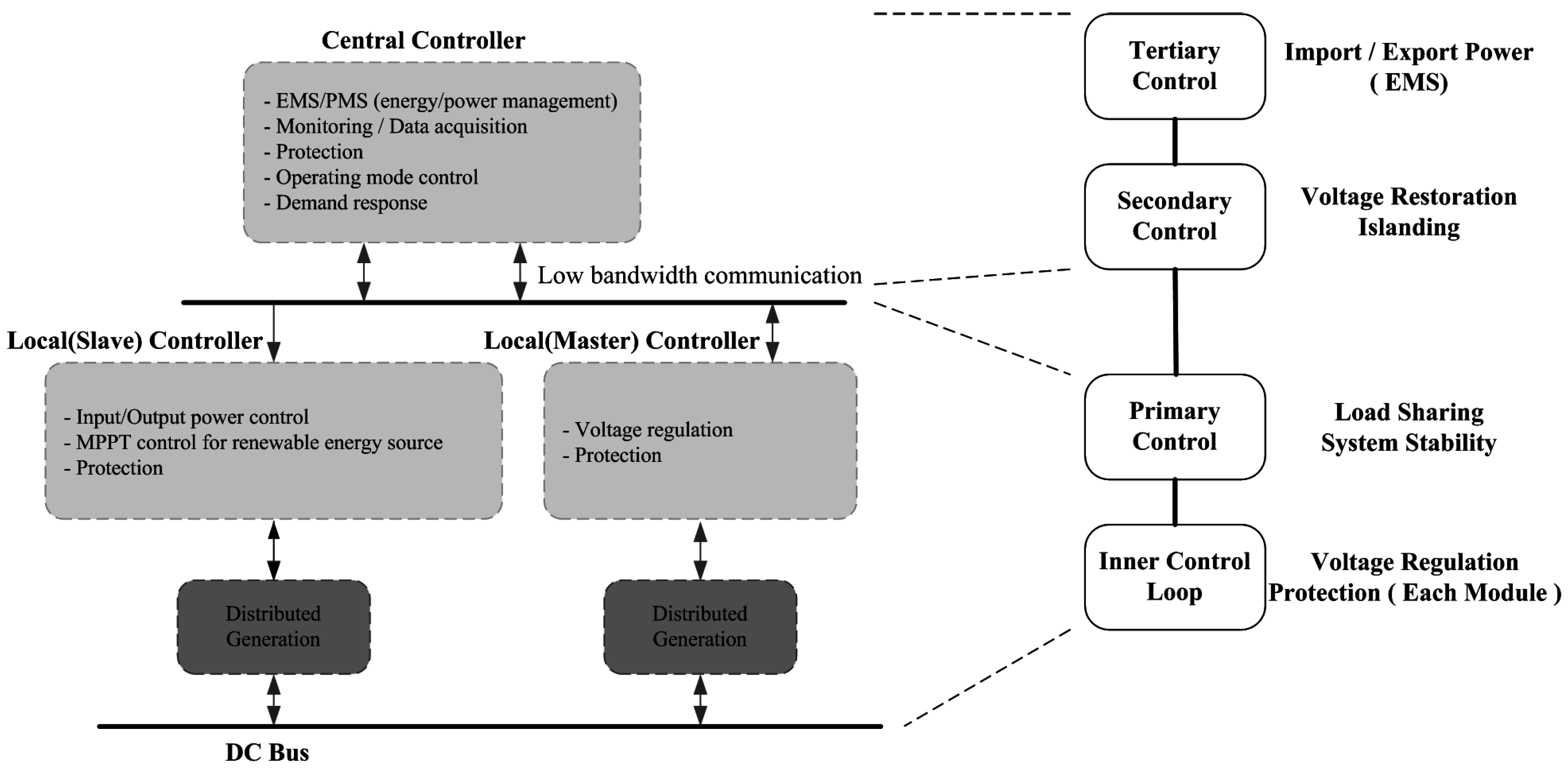 - Central Controller (secondary control + tertiary control): energy management of system, supply and demand prediction, bus quality control using bus voltage regulation, etc.
