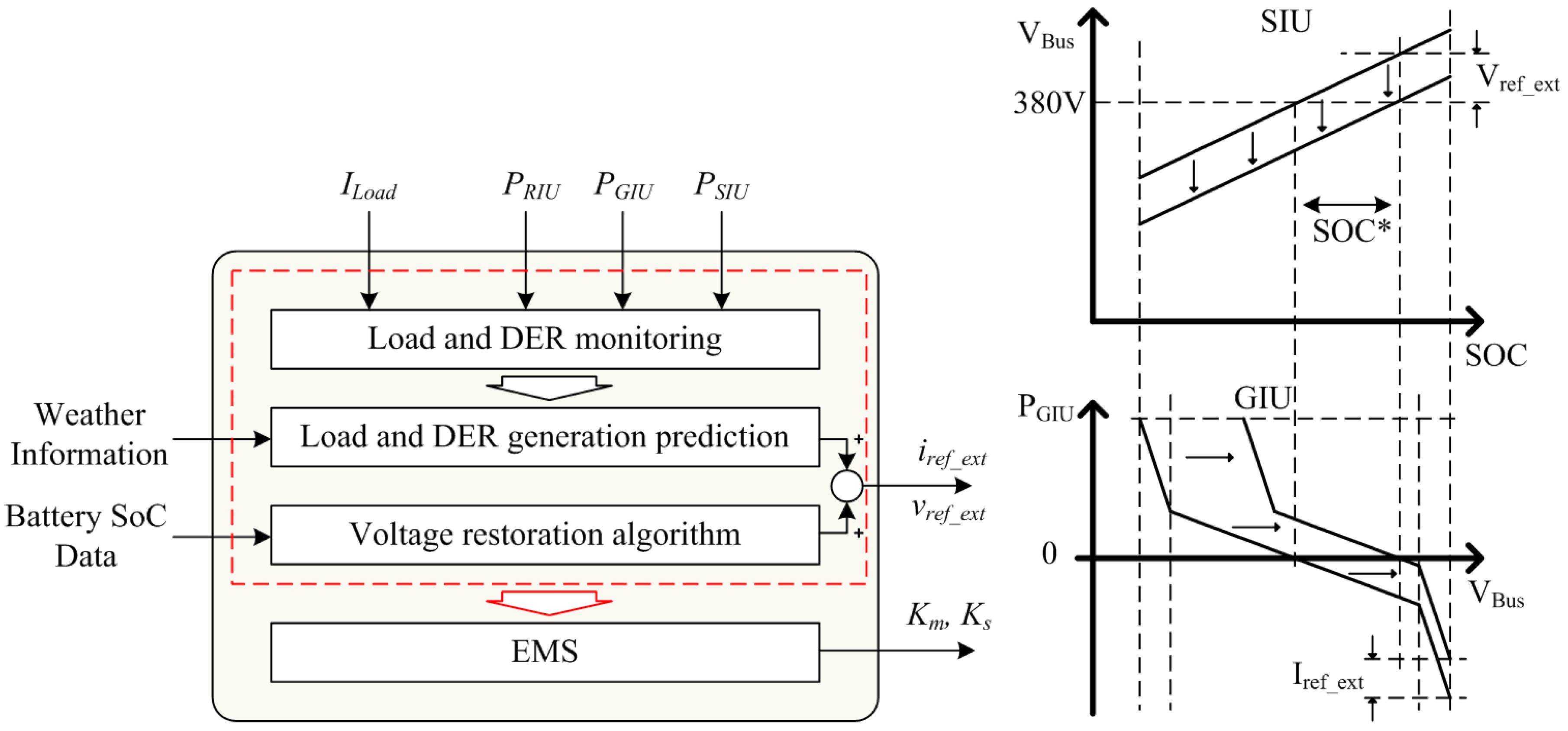 Figure 5 shows a controller block diagram of the master and slave units. External signals vref_ext and iref_ext from the central controller direct voltage restoration and other functions. The master controller is similar to a conventional droop control, except that the droop gain is replaced with Km based on the battery SoC level. The battery SoC level could be delivered from the central controller, but this would require additional communication by the master controller; hence, the SIU is preferred as a master unit. The SIU is directly connected to the battery, and therefore senses the battery output voltage in order to instantly calculate the battery SoC level [22]. Moreover, a DC–DC converter that compares with the GIU can be designed to have a faster voltage controller bandwidth than an AC–DC rectifier. The voltage loop bandwidth of a PFC circuit is often selected to be under 20 Hz in order to avoid 120 Hz distortion from the utility grid; as the performance of a master–slave system is determined by the controller bandwidth of the master unit, it is advantageous to select the SIU as a master in order to obtain higher DC bus quality.