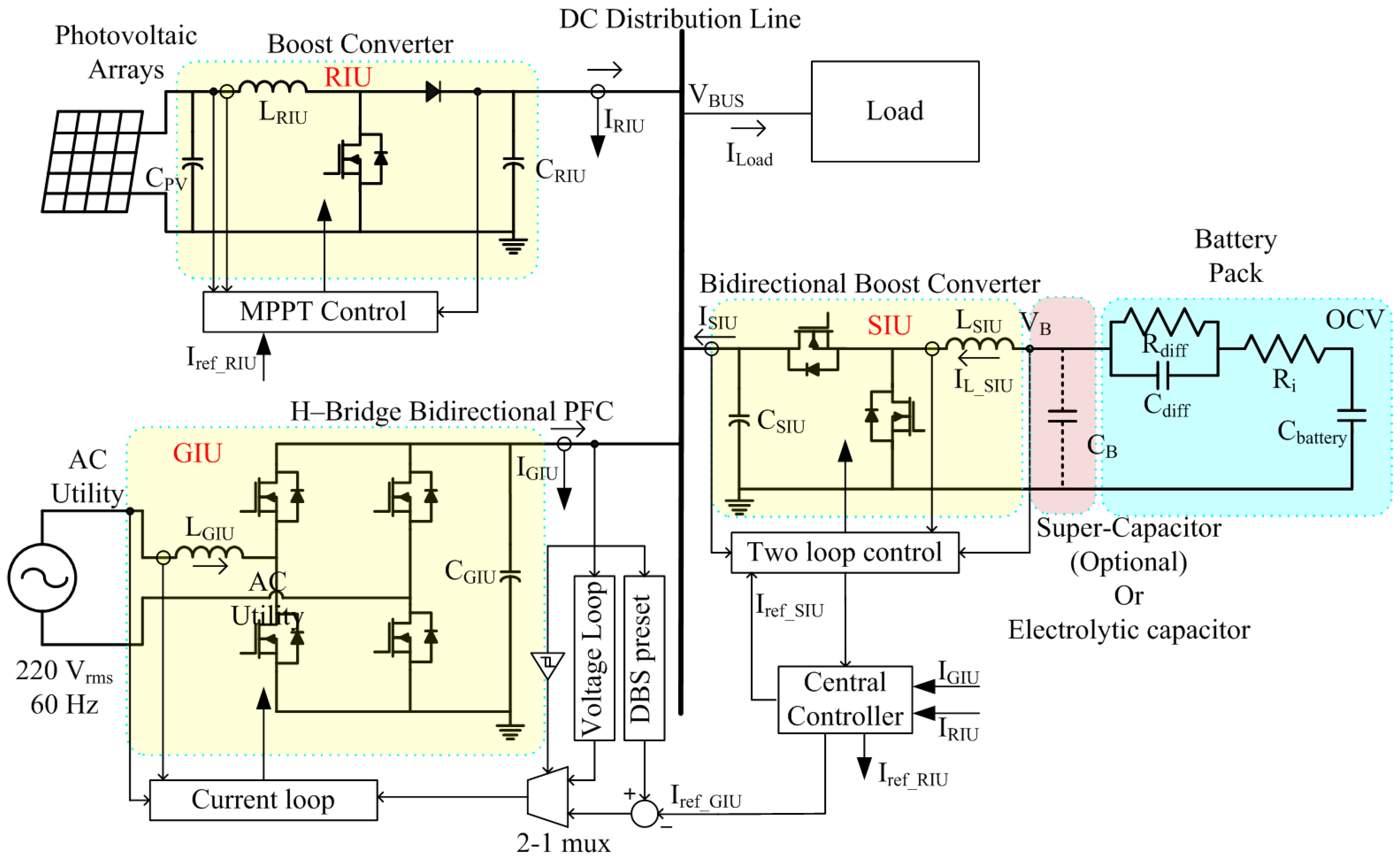The local controller include all functions in each interface unit not involving communication, while the central controller manages additional algorithms for improving power quality and energy management using a communication link. Detailed designs of the local controller and central controller functions are presented as follows