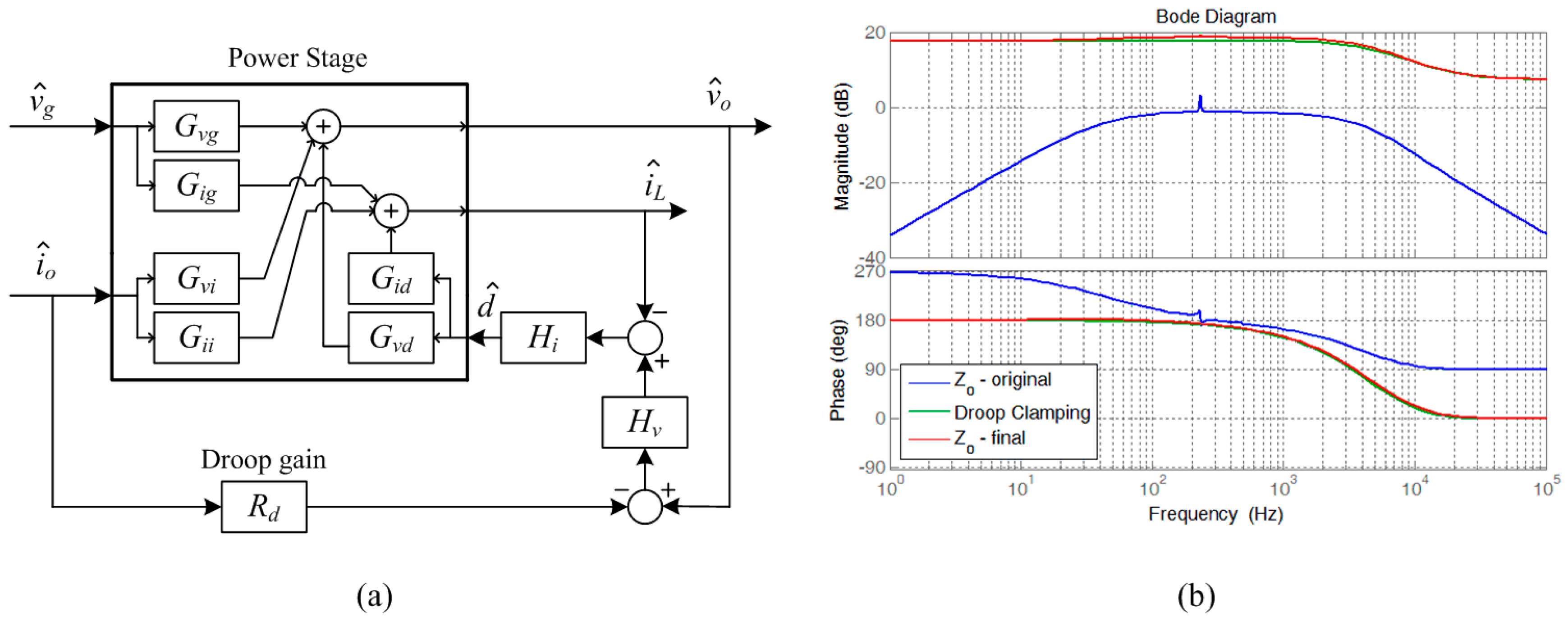 This difference arises from an impedance clamping problem in the droop control method. As shown in the small-signal block diagram in Figure 9a, droop gain is added in the control loop and clamps the low- and high-frequency output impedance of the converter, as shown in Figure 9b. The droop gain Rd clamps the bus impedance of the SIU, and interrupts its dynamic property in all regions.