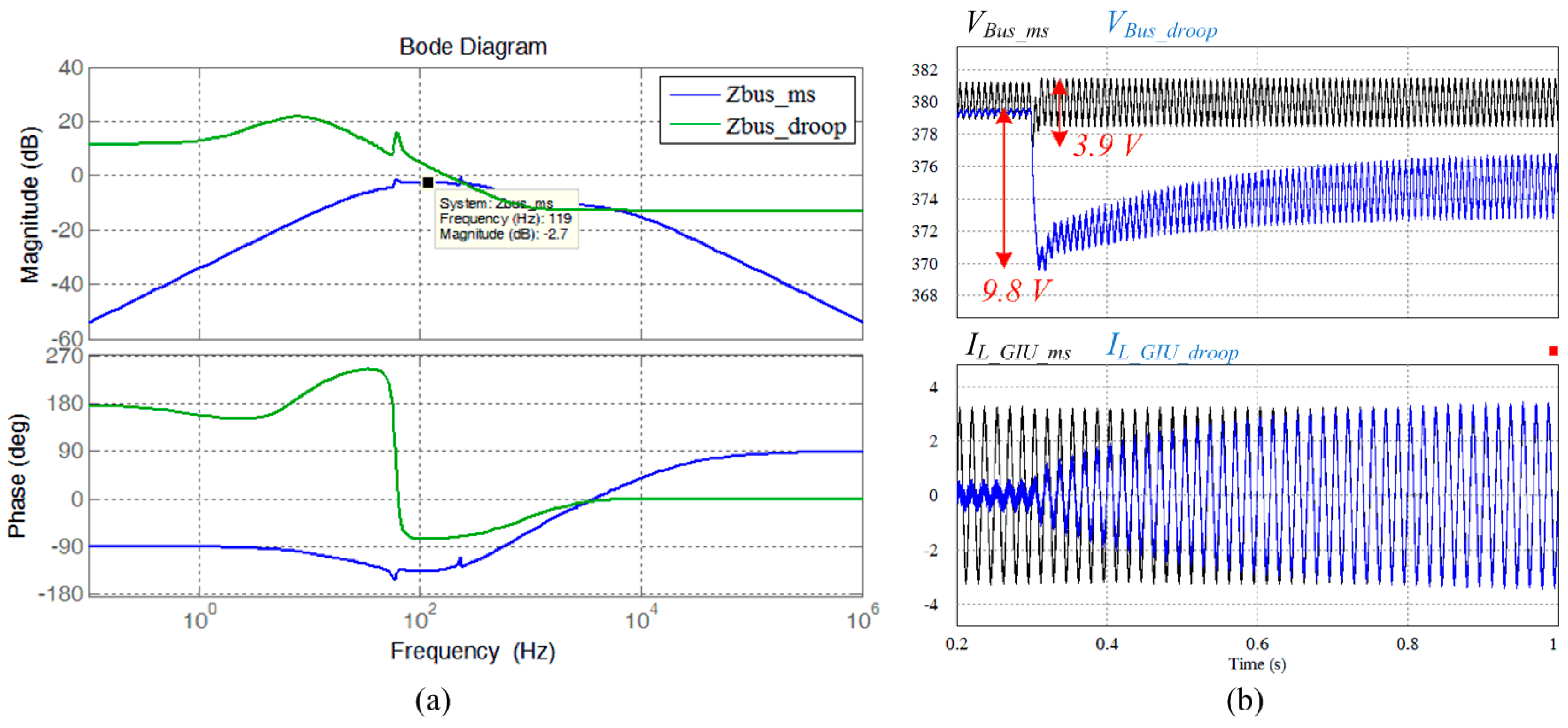 Comparisons between (a) equivalent bus impedance bode diagram and (b) simulation waveforms at step load changing condition.