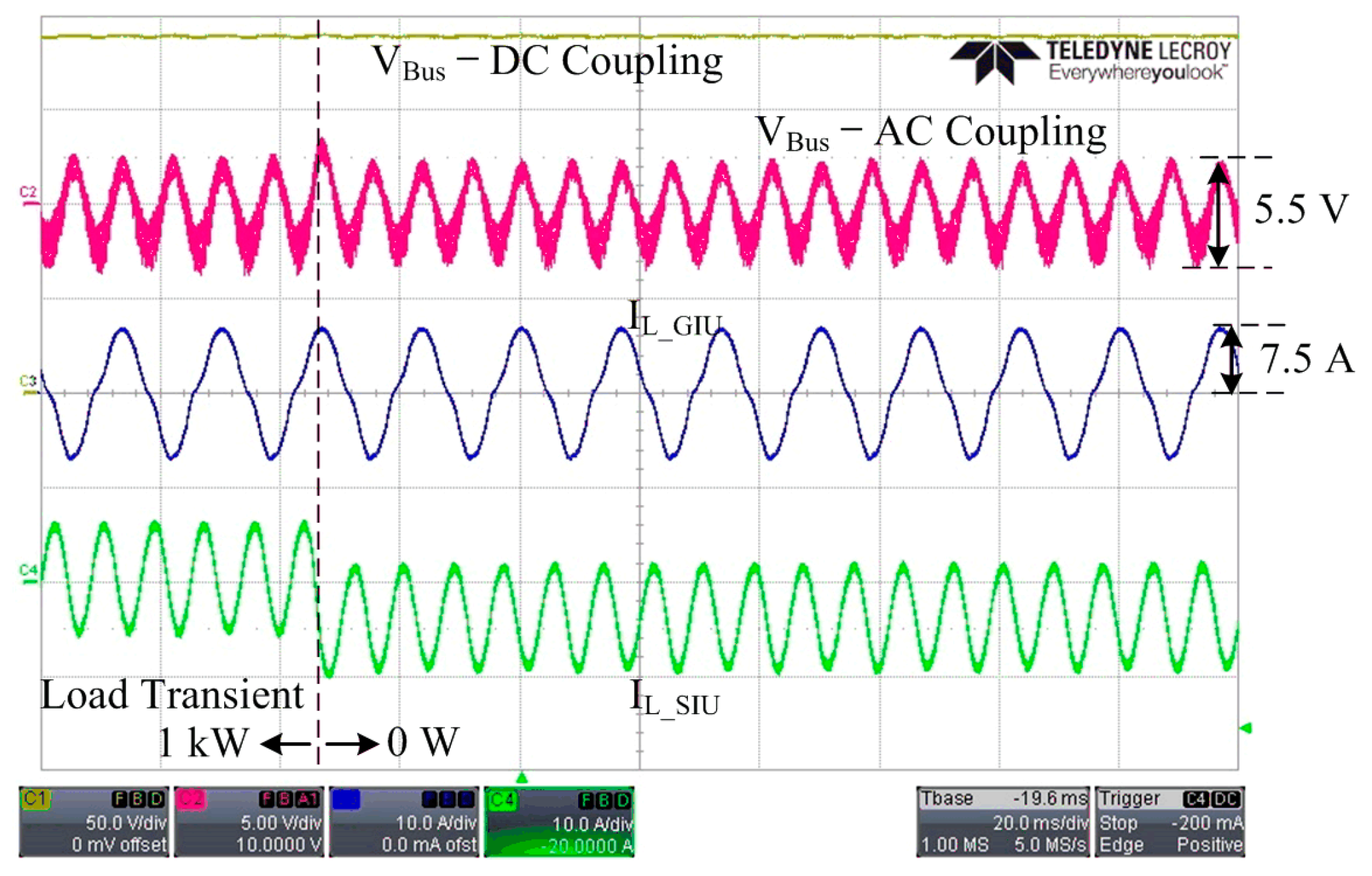 As a result, an inductor current of the SIU changed to a negative value and charged the battery with 1 kW of instantaneous power. A measured bus voltage ripple of 5.5 V well-matched with the 7.5 A peak-to-peak inductor current of the GIU with a designed bus impedance of −2.7 dB.