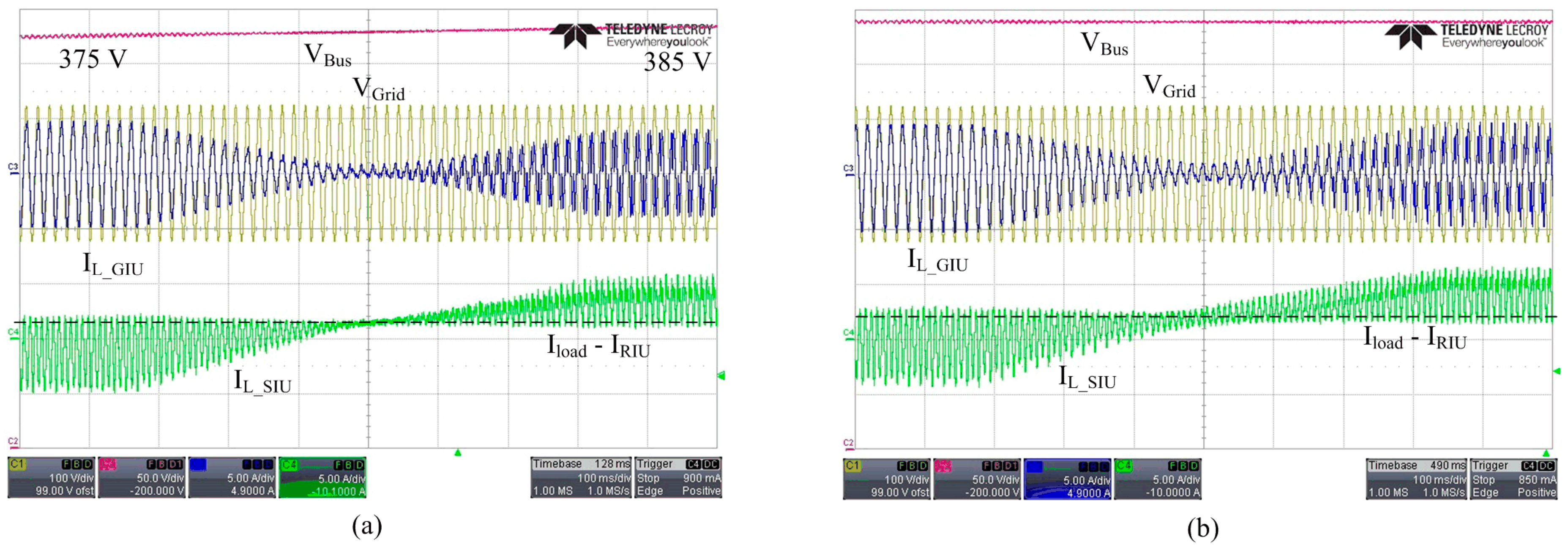 Figure 12 shows the experimental waveforms of the step-load changing condition corresponding to those in Figure 10b. To check the bidirectional operation of the SIU, the load was changed from 1 kW to 0 W, and the GIU generated nearly 1 kW of power.