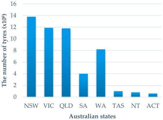 The demand for bioenergy is ever growing due to the depletion of fossil fuels as well as the threats of climate change. One of the greatest challenges in today’s modern society is dealing with the disposal or recycling of solid waste produced by human activity [1,2]. The issue of scrap tyres is of great importance due to the major environmental impact that they cause. Over 1.5 billion tonnes of tyres per annum are discarded all around the globe [3,4,5] weighing 17 million tonnes [6]. In Australia, the number of tyres which are produced annually for passenger cars, trucks and other vehicles is also rapidly increasing. In Australia, the National Tyre Product Stewardship Scheme has been formed to deal with this national problem of end-of-life tyres. According to their report, these tyres are mainly disposed of through landfill or illegally buried in the ground, exported, and only a limited proportion of whole tyres are recycled. The final destination of more than 60% of end-of-life tyres within Australia is not clear. The majority are comprised of either truck or off-the-road tyres which are used mostly in remote areas. Such a great number of waste tyres is problematic from environmental, social, and financial point of view for both the nation and the world. Around 55 million tyres are expected to reach their end of use by the end of 2014, and it is also projected that this number will be considerably enhanced by 2020. Figure 1 shows the number of end-of-life tyres (equivalent to passenger car tyres) in different areas including metropolitan, regional, and also remote areas of each state of Australia [7].