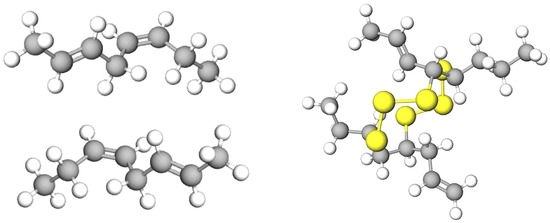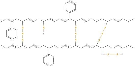 During the manufacturing process sulfur can be added to the rubber to change the properties of the tyre in a process called vulcanization, whereby at certain temperatures, C–H bonds are broken and replaced sulfur atom chains. This vulcanization process forms cross chains in rubber’s structure. It was first introduced in 1800–1860 by Charles Goodyear, to convert the sticky natural rubber into a heavily cross-linked polymer. Figure 2 presents the schematic molecule structure of vulcanized rubber. The yellow molecules represent the cross chains that have been formed by sulfur atoms.