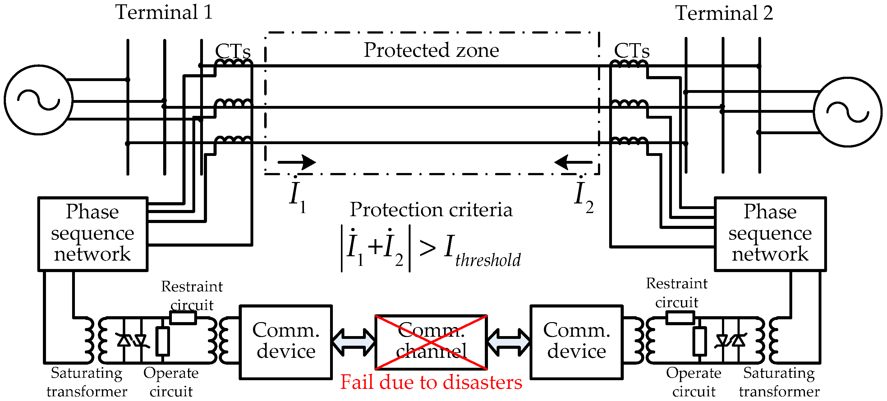 In order to guarantee the safe and stable operation of high voltage transmission lines, differential protection is adopted as the main protection for the benefits of its phase-selection function and immunity to power swings and operation modes [1]. It trips instantaneously for faults in the protected zone. Figure 1 shows the functional setup of the current differential protection. At each terminal, the phase sequence network converts the three-phase currents from the line current transformers into a single-phase voltage, which is applied to the relay circuits via the saturating transformer. Acting as an impedance matching device between the relay circuit and the data acquisition circuit, the primary winding is connected to the restraint and operating circuits [2]. The local and remote current values are sampled to calculate the differential current. When a fault occurs in the protected zone, the differential current value will exceed the operation threshold and the protection will operate to clear the fault. A stabilization technique named percentage restraint is commonly used to conquer the errors from different ratios, saturation of the current transformer (CT) channel delay measurement, and finite sampling frequency [3].