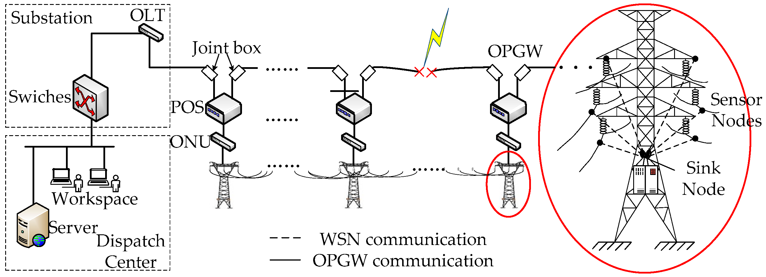 - Chen, X.; Du, Z.; Yin, X.G.; Pan, W.; Xu, L.Q. A Design of WSN and EPON applied in online monitoring for transmission line. Adv. Mater. Res. 2014, 950, 125–132. [Google Scholar] [CrossRef]