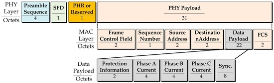 where Lo is the length of PHY packet in octet and f0 is the fundamental frequency. Based on the packet frame in Figure 4, Lo is 37 octets. Therefore, to meet the IEEE 802.15.4 data rate constraints (250 kbps PHY data rate at 2.45 GHz) [26], Ns can be set as 16. If using Fourier algorithm by extracting current in a cycle data window to form a phasor, the data window will slide backward once every integer times of sampling period nTs. Specifically speaking, given 16 current values are sampled in a cycle, a new data window is constructed by adding the latest sampled current value to the end of the remaining 15 values after 1.25 ms. The data rate of phasor criterion is calculated by: