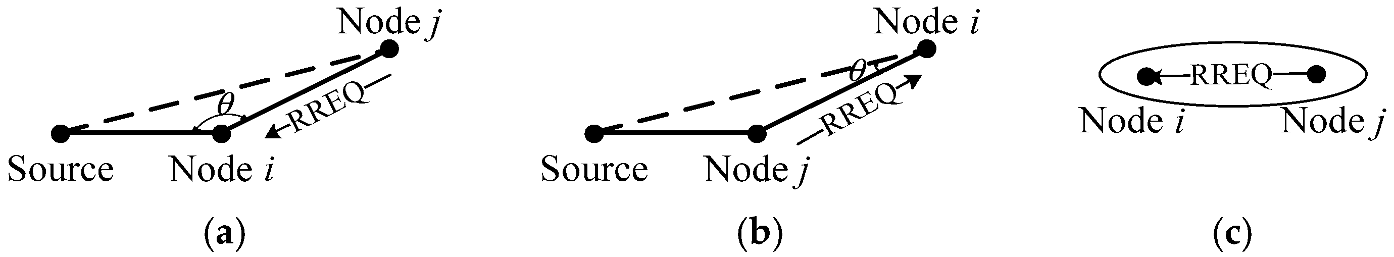 - As shown in Figure 5a, if θ > θth, node j is added to the forward list of node i. Namely, node i is the intermediate node from the source to node j.