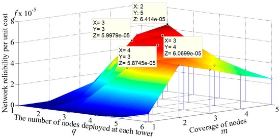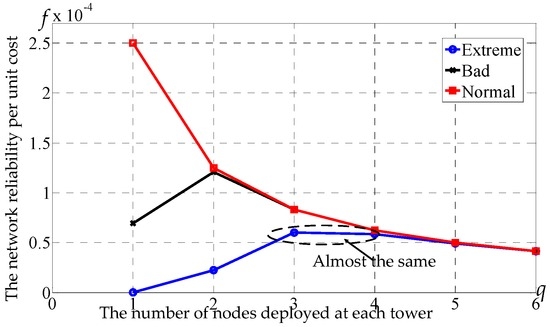 The network reliability and cost is not only related to the number of nodes deployed at each tower but is also related to communication range of nodes. To comprehensively illustrate the tradeoff between cost and reliability in extreme weather, we consider an 80-tower network consisting of five practical types of nodes that has different RF modules and thus different prices (Table 3). Figure 7 shows the effect of the communication range with respect to network reliability per unit cost. In the case of fixed node cost, the total cost grows with an increasing number of nodes deployed at each tower. In the case of adaptive node cost depending upon communication range, total costs increase rapidly if using better nodes. Thus, it can be profitable to deploy nodes according to the network reliability per unit cost. According to results in Table 3, deploying two five-tower coverage nodes at each tower is suggested.