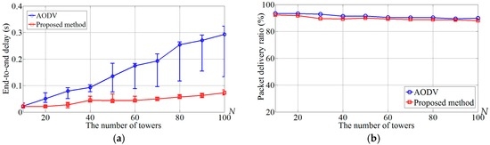 The end-to-end delay of AODV significantly increases to 0.3 s with the number of nodes increasing, as shown in Figure 9a. The main reasons are repeated routing request time and overlapped routing paths. On the other hand, the proposed method shows low end-to-end delay compared with AODV, since the proposed method has no other round of route discovery before transmitting data. As for the packet delivery ratio in Figure 9b, the proposed method is comparable to AODV because the network congestion causing collision and drops of the packets of AODV is comparable to the proposed routing protocol.