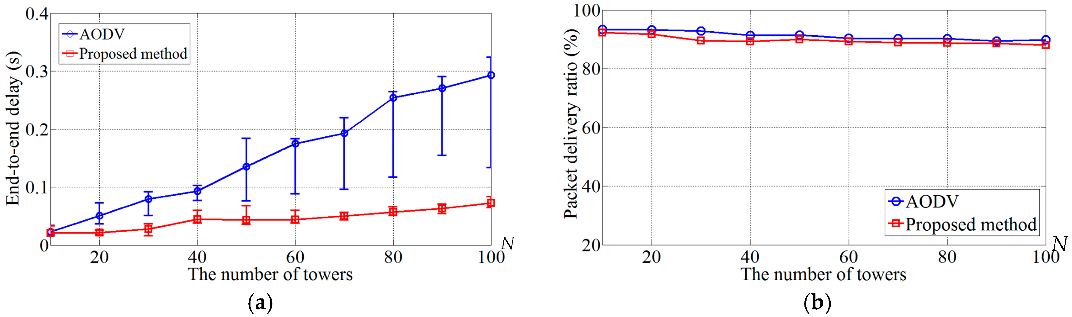 In this section, we evaluate the proposed routing protocol in some metric of the RCC performance. Compared with conventional AODV routing protocol, the evaluation analysis includes end-to-end delay and packet delivery ratio. In this simulation, the NS-2 and IEEE 802.15.4 PHY/MAC protocol are used. All the statistics of the evaluation are acquired from the packet–trace report of NS2. We use WSN as a transparent medium that passes CBR (constant bit rate) traffic. The maximum receiving range and carrier sensing range are 1600 and 3520 m, respectively. There are 80 towers in the network. The neighbor tables of the forward and backward list are created by the link status message with one-hop broadcast.