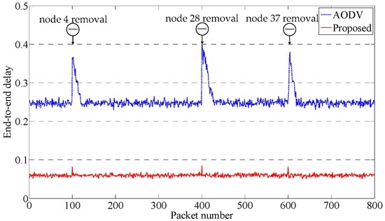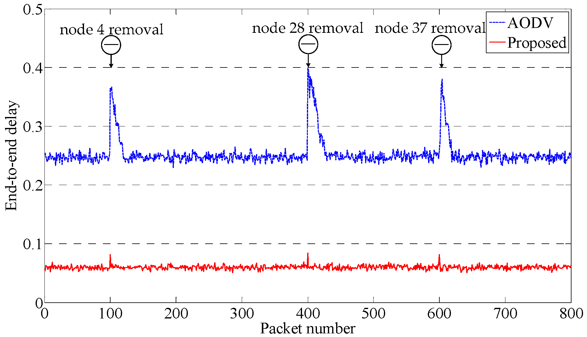 Figure 10 evaluates the proposed routing protocol after the removal of some nodes. A removal of a key relay node leads to initiations of the next route discovery for AODV, which results in high end-to-end delay of the coming data packet. In this case, the proposed method can quickly recover the broken route.