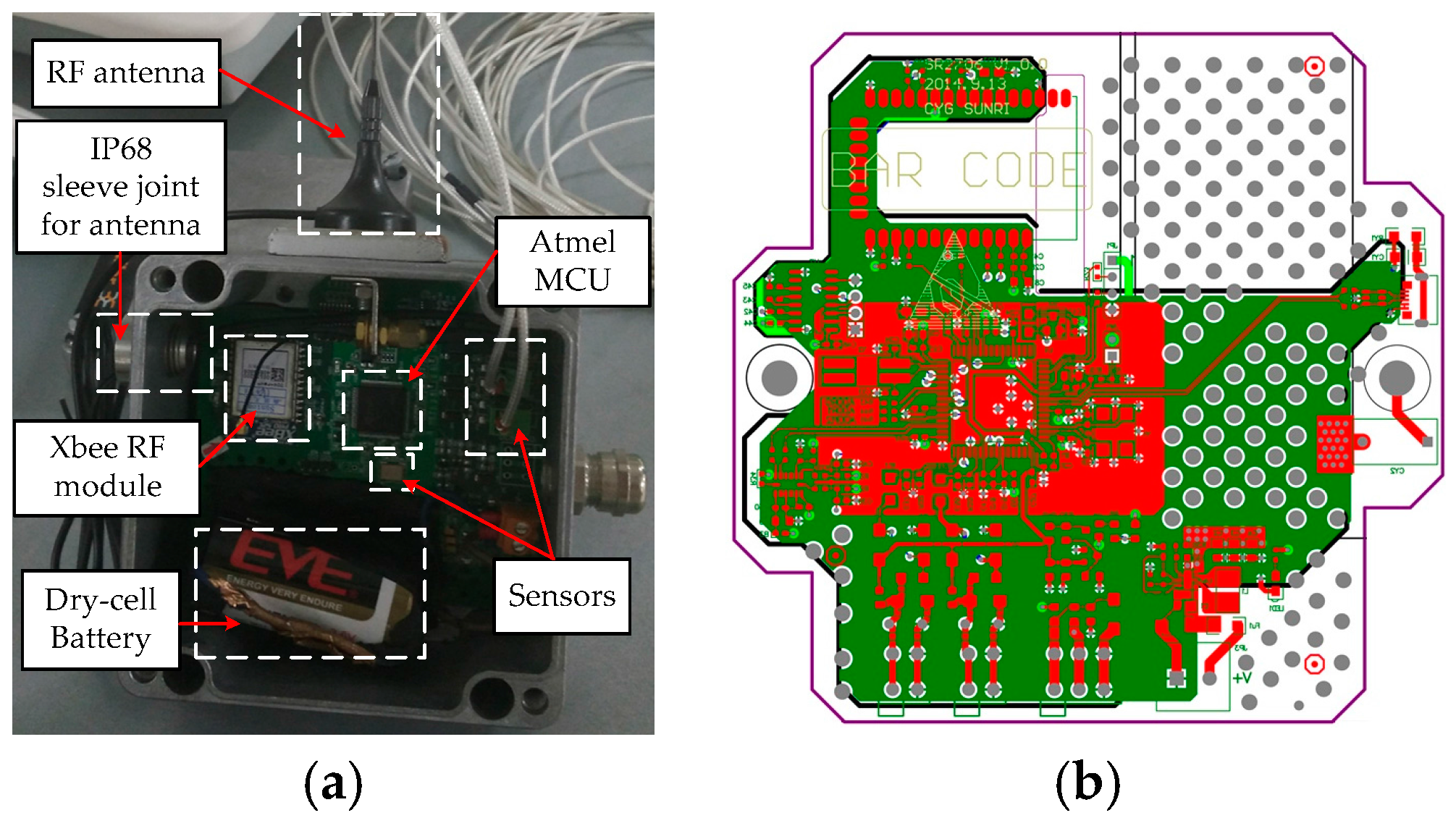 Experimental prototype of wireless sensor devices. (a) wireless sensor node in shell; and (b) and printed circuit board (PCB) design of wireless sensor module.
