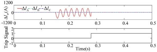 Differential current of each phase and the trip signal (single-phase-to-ground fault happens at 0.16 s).