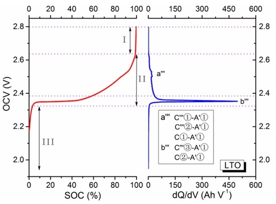 35], respectively. In view of the flat plateau of the LTO anode, the dQ/dV curve primarily reflects the characteristics of the NMC+LCO cathode and the LTO anode. However, due to the approximate phase transformation voltage of LCO and NMC, overlaps of peaks will appear in the dQ/dV curve of the LTO lithium-ion battery. The three stages of the SOC-OCV curve of the NMC+LCO/LTO batteries are similar to those of LMO/graphite and LFP/graphite batteries.