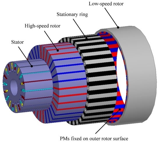 - Tian, Y.; Liu, G.H.; Zhao, W.X.; Ji, J.H. Design and analysis of coaxial magnetic gear considering rotor losses. In Proceedings of the 2015 IEEE Magnetics Conference (INTERMAG), Beijing, China, 11–15 May 2015; pp. 1–4.