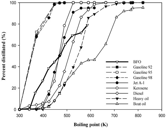 Simulated distillation characteristic of BFO for HTC of JO at TC = 683 K, tr = 60 min and PH2 = 0.69 MPa (100 psig) comparing with those of different fuels. BFO: this study; fuels other than BFO: Chang et al. [26].