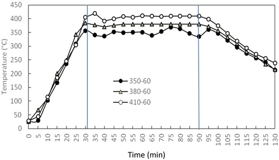 Time (t) variations of temperature (T) during heating, constant-temperature reaction and cooling for three TC. Retention time = 60 min; 350-60: TC in °C-t in min.