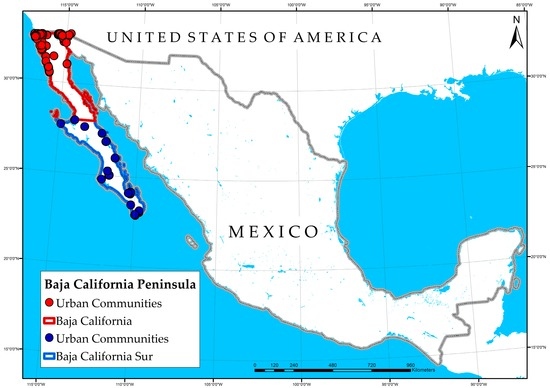 The Baja California Peninsula is located in northwest Mexico, bordering to the North with the United States and bounded by the Pacific Ocean to the east and Cortes Sea to the west. The peninsula has two states or provinces: Baja California and Baja California Sur. The first has 853,254 households and the second has 174,441 households, respectively, and between them, urban electrification is around 97.6% (Figure 1).