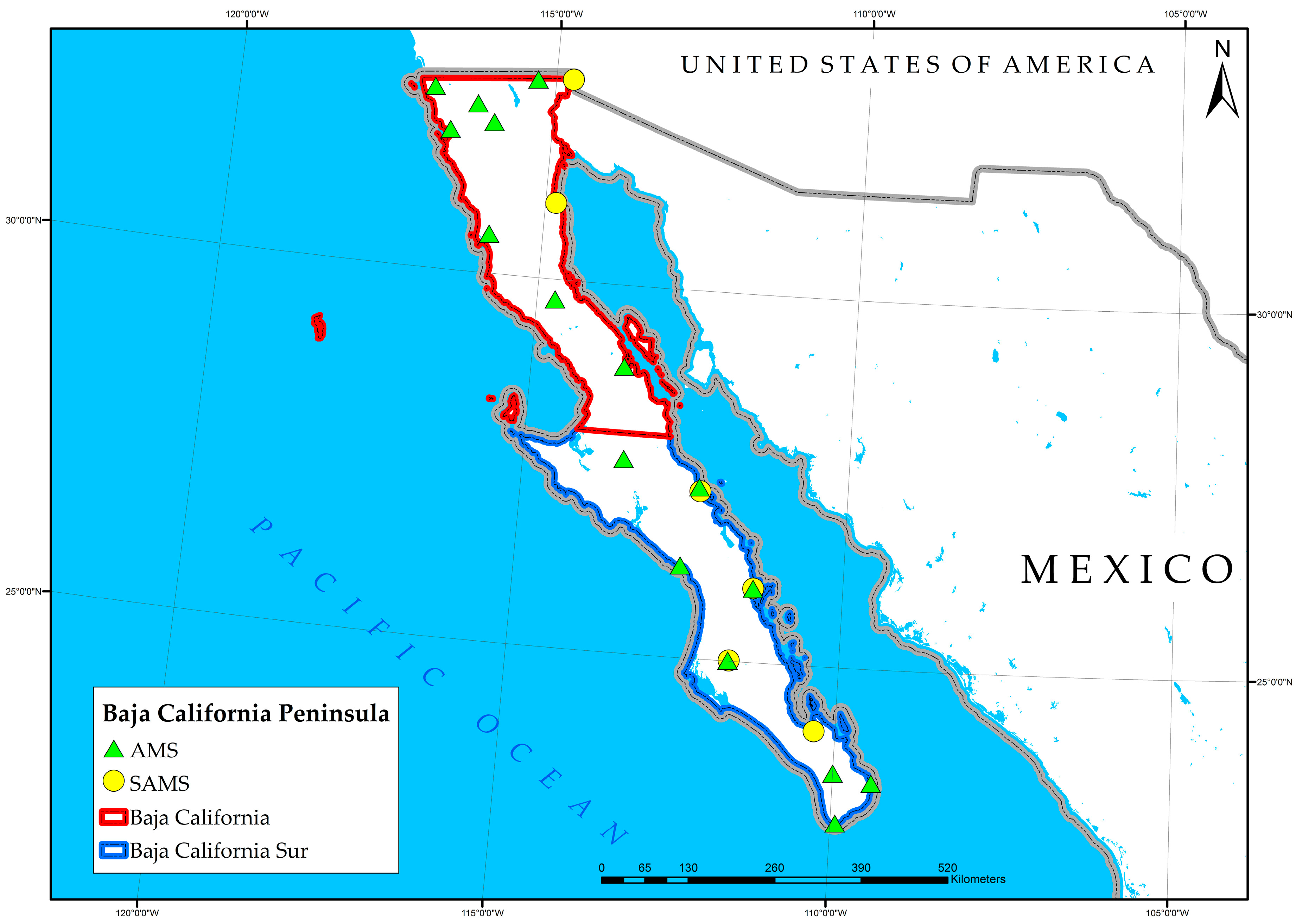 Meteorological station coordinates along the Baja California Peninsula.