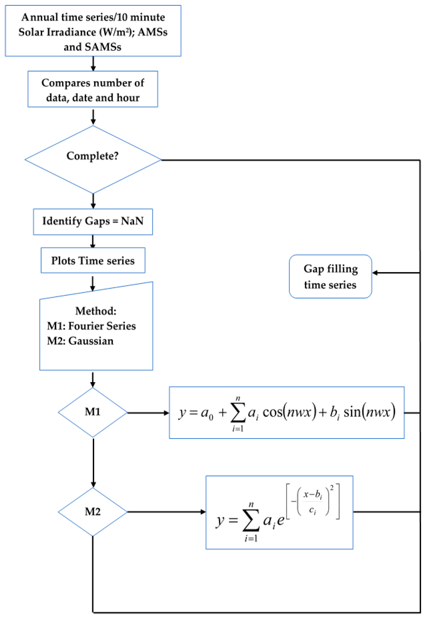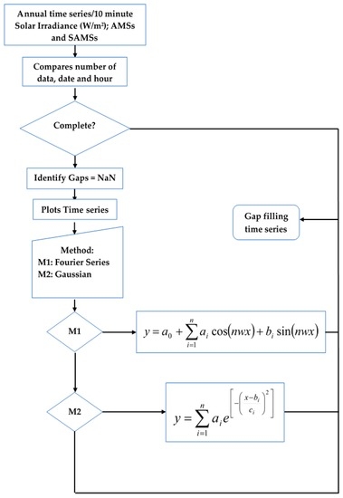 Data from fixed sensors eventually loses records and time series will be incomplete. To solve this situation a MatLab application, summarized in Figure 3, has been used. Input data are recorded hourly every 10 min, so an hour has six records and a month 4032, 4320 or 4464, respectively, depending on whether it is 28, 30 and 31 days long. Next the application compares the number of data per hour, and if it finds missing data it displays a graph and selects the best gap filling model, e.g., 2 January 2010 has missing data, so this application compares the plots and the best fit is chosen (see Figure 4).