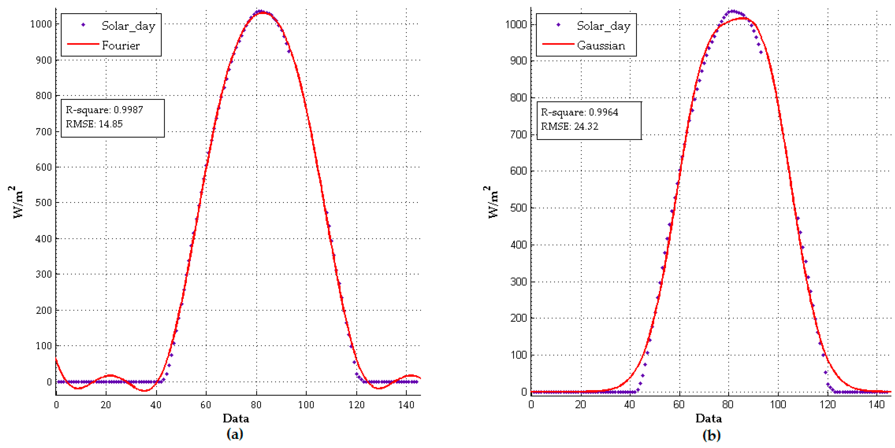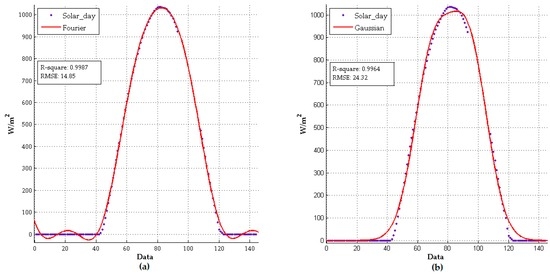 Figure 4 illustrates how the application works. In this case two models were used, a Fourier and a Gaussian one, and even though both have an R-square value of 0.99 the Gaussian model does not fit the date well. The Fourier series is a sum of sine and cosine functions that describes a periodic signal. It is represented in either the trigonometric form or the exponential form and is given by Equation (1):