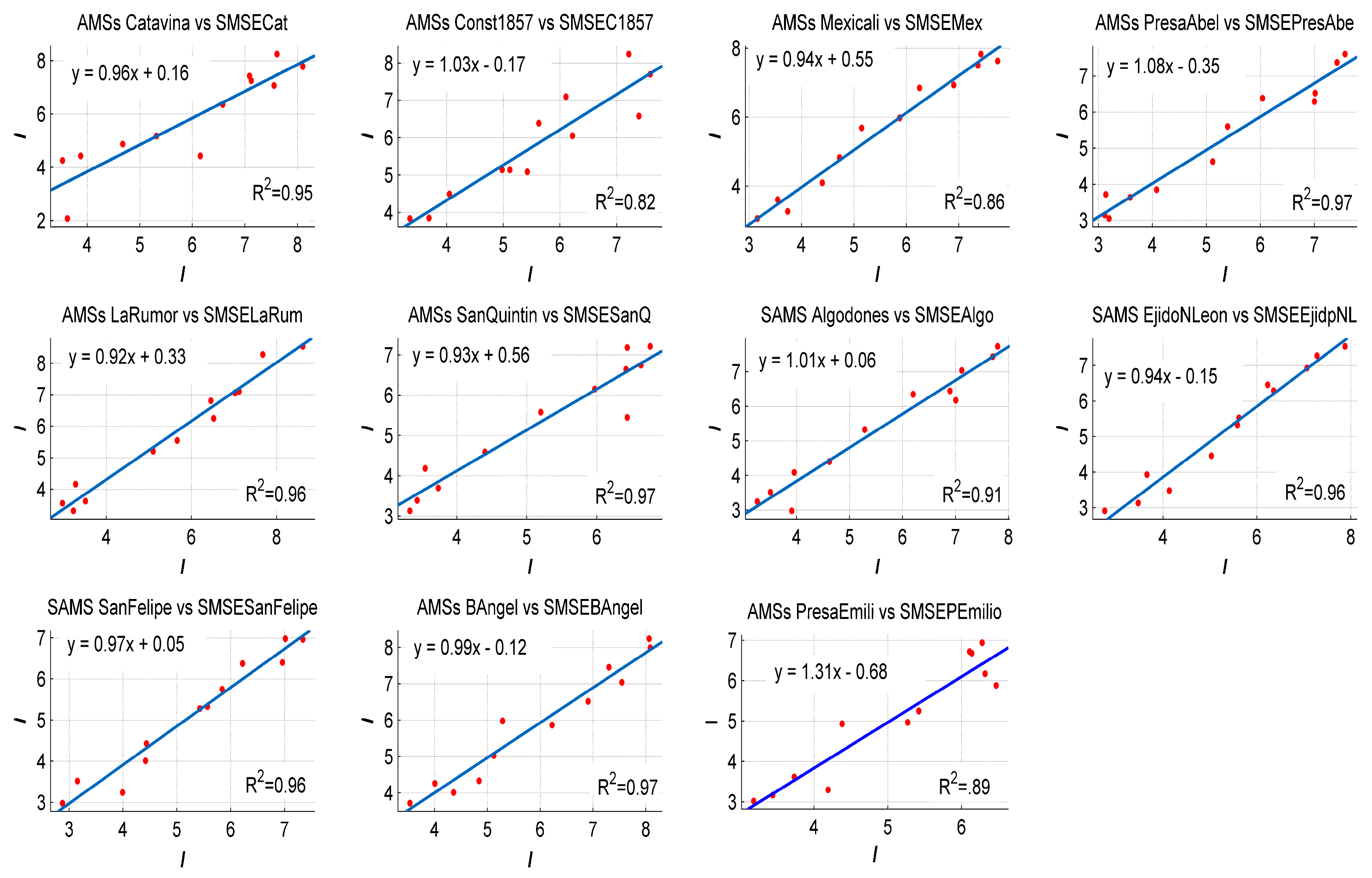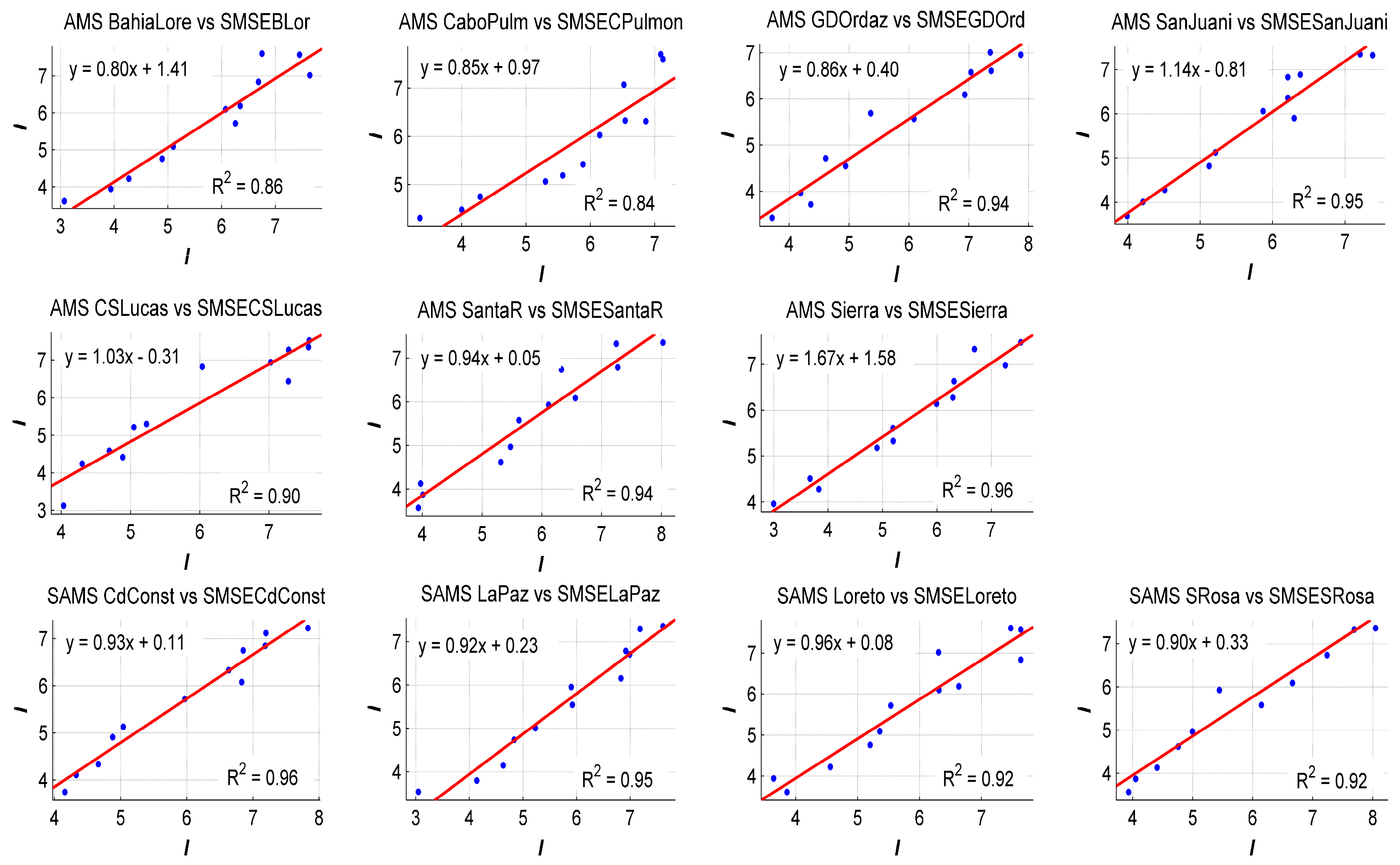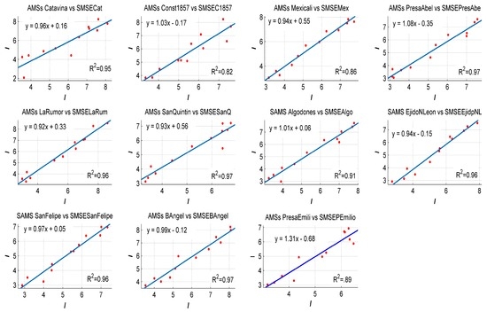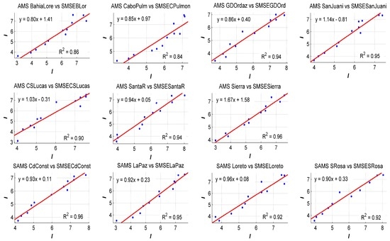 As we can see in Figure 5, linear fitting allows us to determine if we could use SMSE data for the assessment. The highest R-square value is 0.97 for AMSs PresaAbel, SanQuintin and BAngel, while the lowest R-square value is 0.82 corresponding to AMSs Const 1857. It is important to mention that SMSE data were extracted at the same geographic postion as the AMSs and SAMSs. In Baja California Sur, linear regression between AMSs and SAMSs versus SMSE data demonstrated that SMSE could be used to assess solar energy. In Figure 6, the highest value of R-square is 0.96 corresponding to SAMS CdConst and the lowest R-square 0.84 corresponds to AMS BahiaLore.
