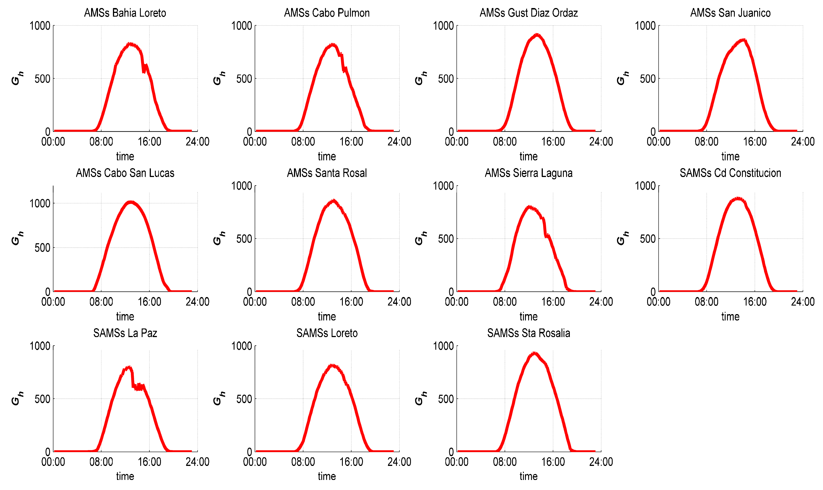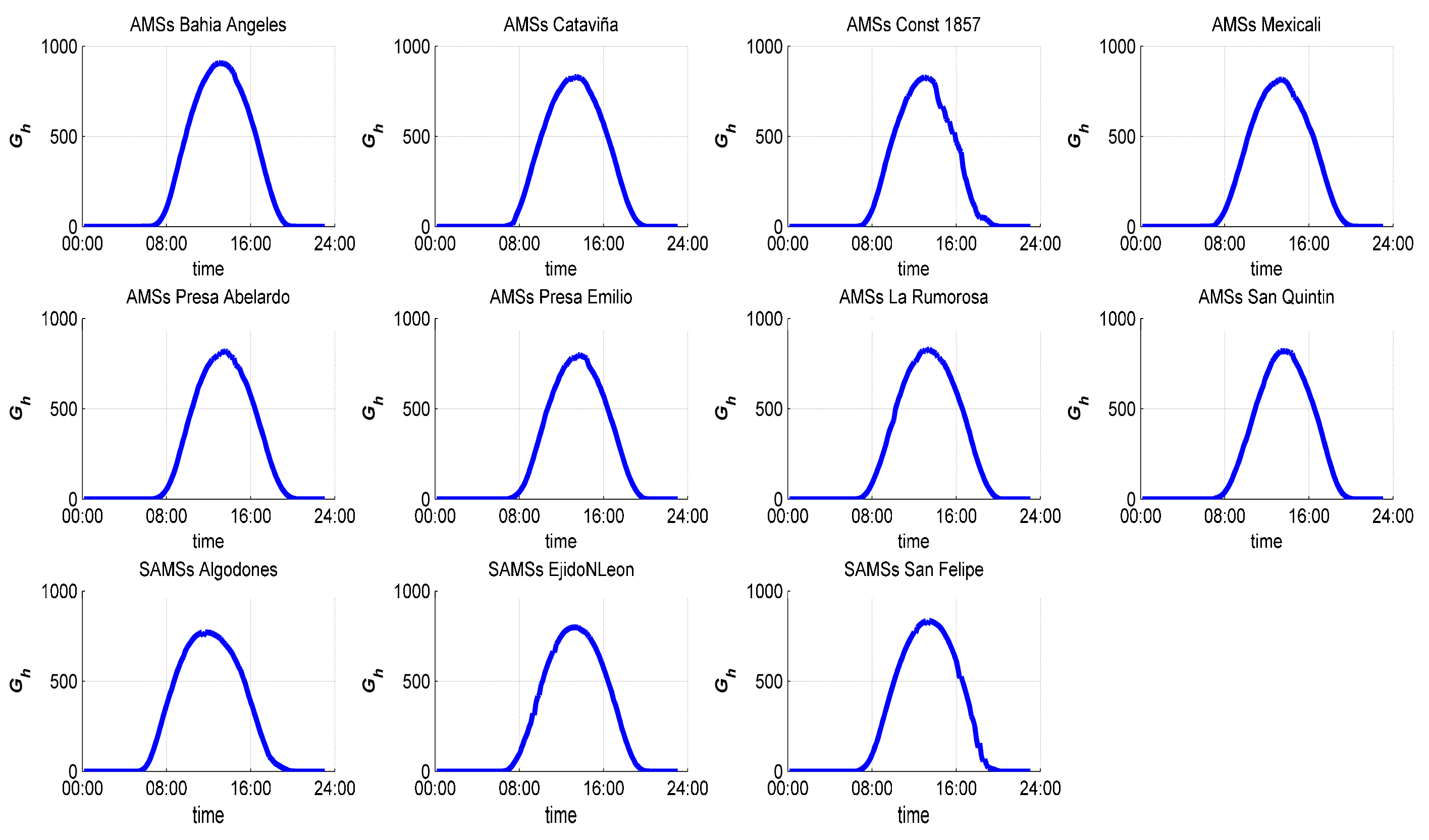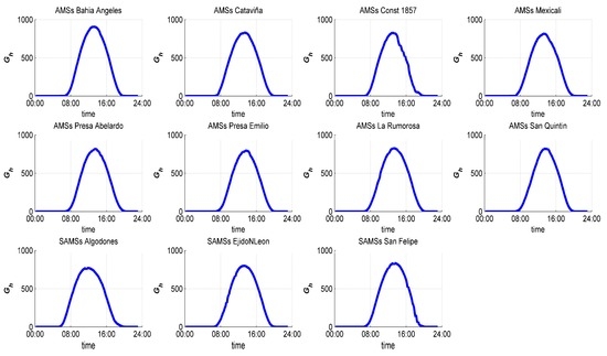 An average day called daily pattern could help to identify how the irradiance is distributed at a site, and with it, it is possible to determine a model. This daily pattern is obtained grouping all the records at the same hour of all months. The results are represented in this work by two blocks of graphics, grouped by states (Baja California in Figure 7 and Baja California Sur in Figure 8), respectively. This pattern could be obtained as a result of the different methods applied.