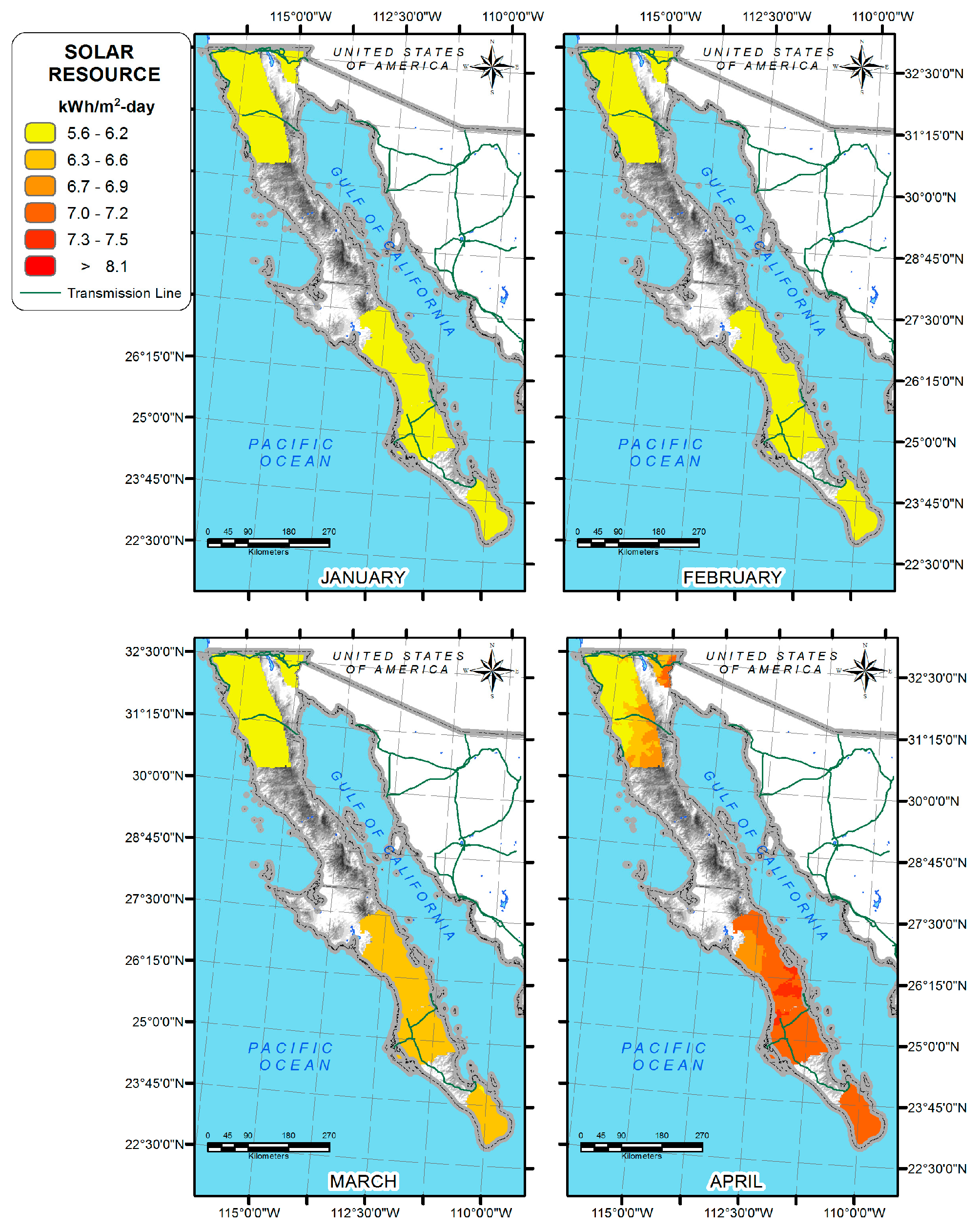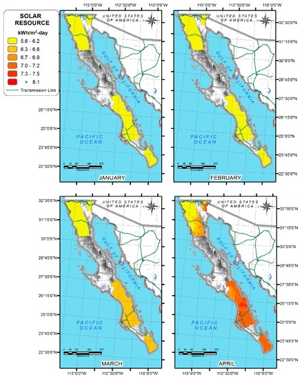 Irradiation on the Baja California Peninsula, January to April.