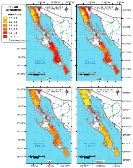 If the Peninsula is analyzed separately, on the one hand Baja California presents in the north the highest value (over 8.1 kWh/m2/day) in May and June, as is shown in Figure 10, while the rest of Baja California during the same months has a range between 5.6 kWh/m2/day to 7.5 kWh/m2/day. Baja California Sur in May (Figure 10) has a solar resource between 7 kWh/m2/day to more than 8.1 kWh/m2/day in the whole analyzed territory, and in June its range is 6.7 kWh/m2/day to 7.2 kWh/m2/day. The whole Peninsula has more than 5.6 kWh/m2/day during the whole year. It is important to clarify that maps represent only the solar resources in urban zones, blank spaces are not considered to this work.