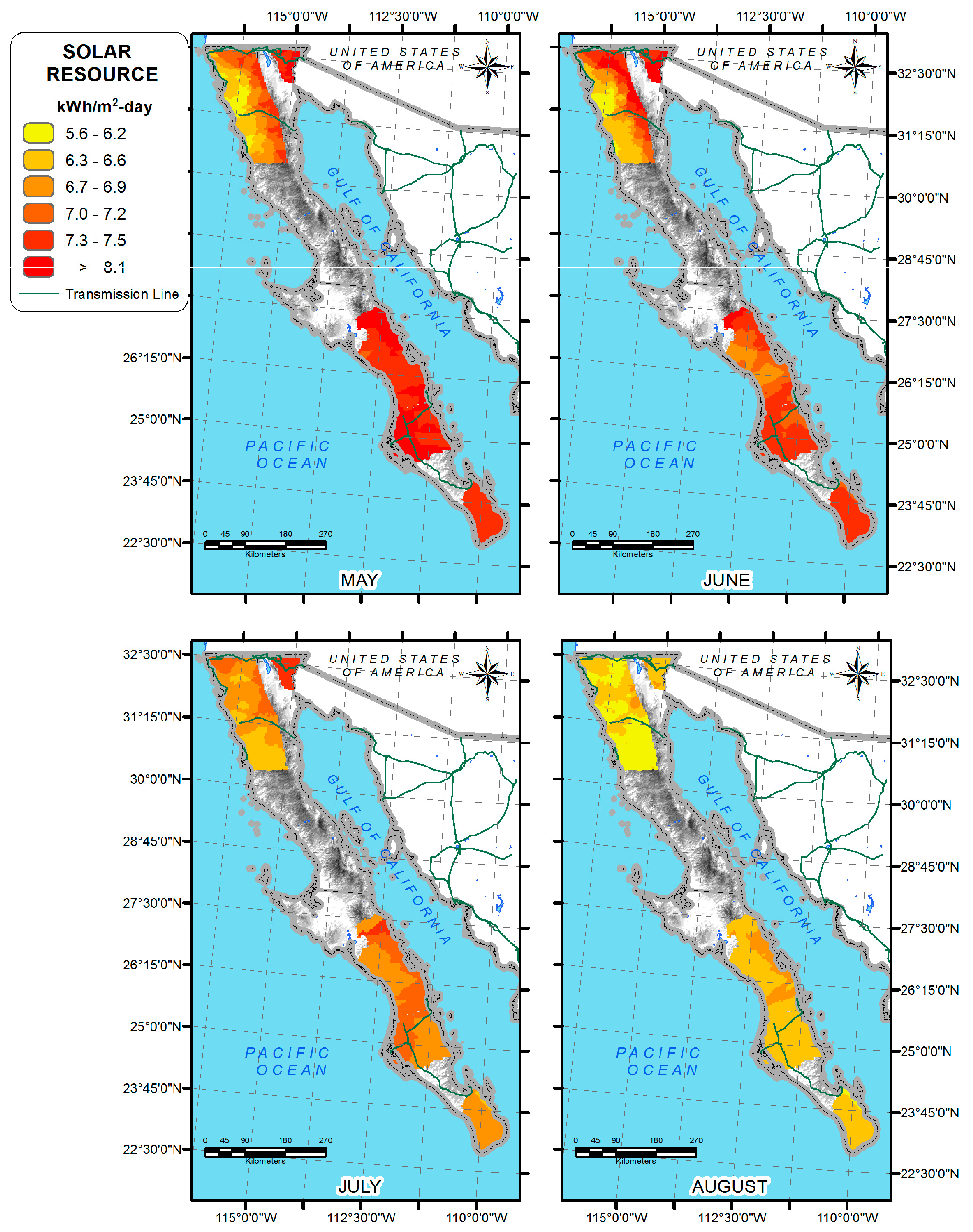 Irradiation at the Baja California Peninsula, May to August.