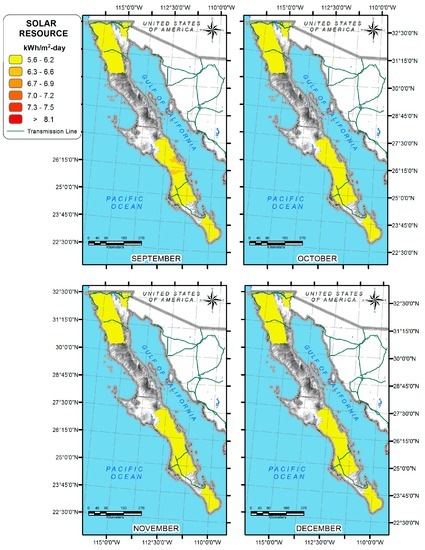 This study presents the magnitude ranges of solar energy in the Baja California Peninsula, which almost 2.4% of urban communities are not electrified [16]. According to previous studies, the average solar resource in the whole of Mexico is 6.5 kWh/m2/day [12]; in this work the average for the whole Peninsula was 5.7 kWh/m2/day (see Table 3).