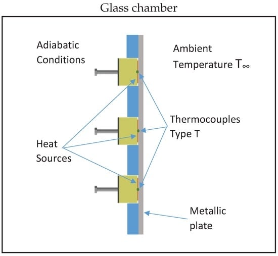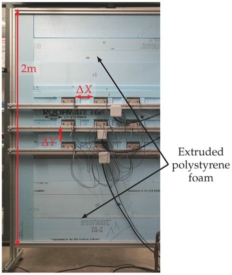 Figure 1 represents a cut plane of the experimental setup. Nine rectangular heat sources were flush-mounted on one side of a 2 mm-thick vertical metallic plate, whose dimensions are 200 cm in height and 150 cm in width (see also Figure 2 and Table 1). The other side of the plate is free, and cooled by natural convection. The horizontal and vertical spacing between the heat sources— and , respectively—can be varied easily. Only regular distributions were considered, with three rows and three columns of heat sources. The metallic plate was made of type 304 stainless steel with a low emissivity of around 0.1.