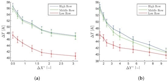 Example of the measured excess temperature averaged on each row of heat sources (a) as a function of the horizontal spacing for a fixed vertical one; and (b) as a function of the vertical spacing for a fixed horizontal one.